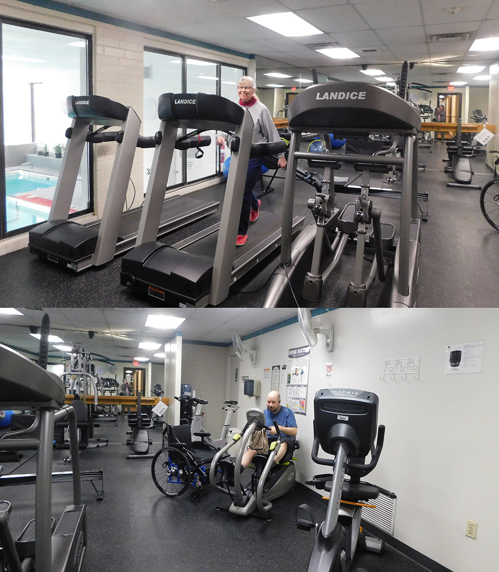 A fully equipped exercise room with weight machines, treadmills, stationary bikes and more!